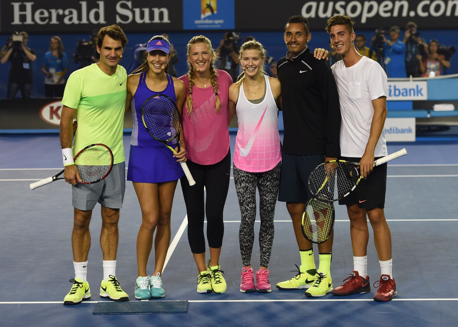 - SCHAUWETTKAMPF: Roger Federer, Ana Ivanovic, Victoria Azarenka, Eugenie Bouchard, Nick Kyrgios und Thanasi Kokkinakis (v.li.) posen bei den Australian Open 2015.