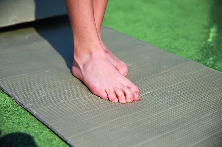 Anders als in der Halle rutschen Sie auf Sand häufig zu den Bällen. Vor allem am Anfang der Saison, wenn das Timing fehlt und die Plätze oft noch weich sind, besteht dabei eine hohe Verletzungsgefahr. In der Akademie von Klaus Hofsäss absolvieren die Schüler deshalb regelmäßig gymnastische Übungen für die Füße, die ein wenig seltsam aussehen, aber effektiv sind. Dazu zählt unter anderem das sogenannte Zehenkrabbeln (1). Sie verbessern damit Ihr Gefühl in den Zehen. Einen ähnlichen Effekt hat die Übung auf Bild 2. Sie greifen einen Stift mit den Zehen und übergeben ihn an den anderen Fuß. Oder: Sie zerreißen mit den Füßen eine Zeitung (3). „Man stärkt dadurch das Fußgewölbe, die Koordination der Füße wird besser, die Verletzungsgefahr sinkt“, erklärt Hofsäss. Der Coach empfiehlt, am Anfang der Saison mit alten Schuhen zu spielen oder sogar mit profillosen Hallenschuhen, weil so das Rutschen erleichtert wird.