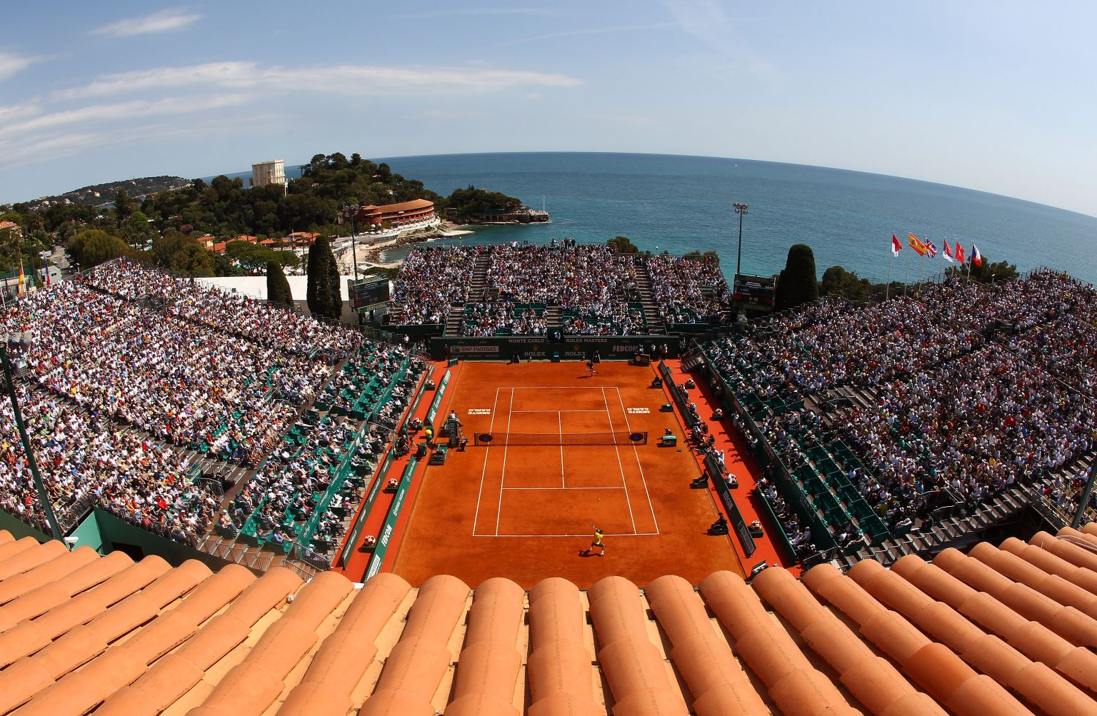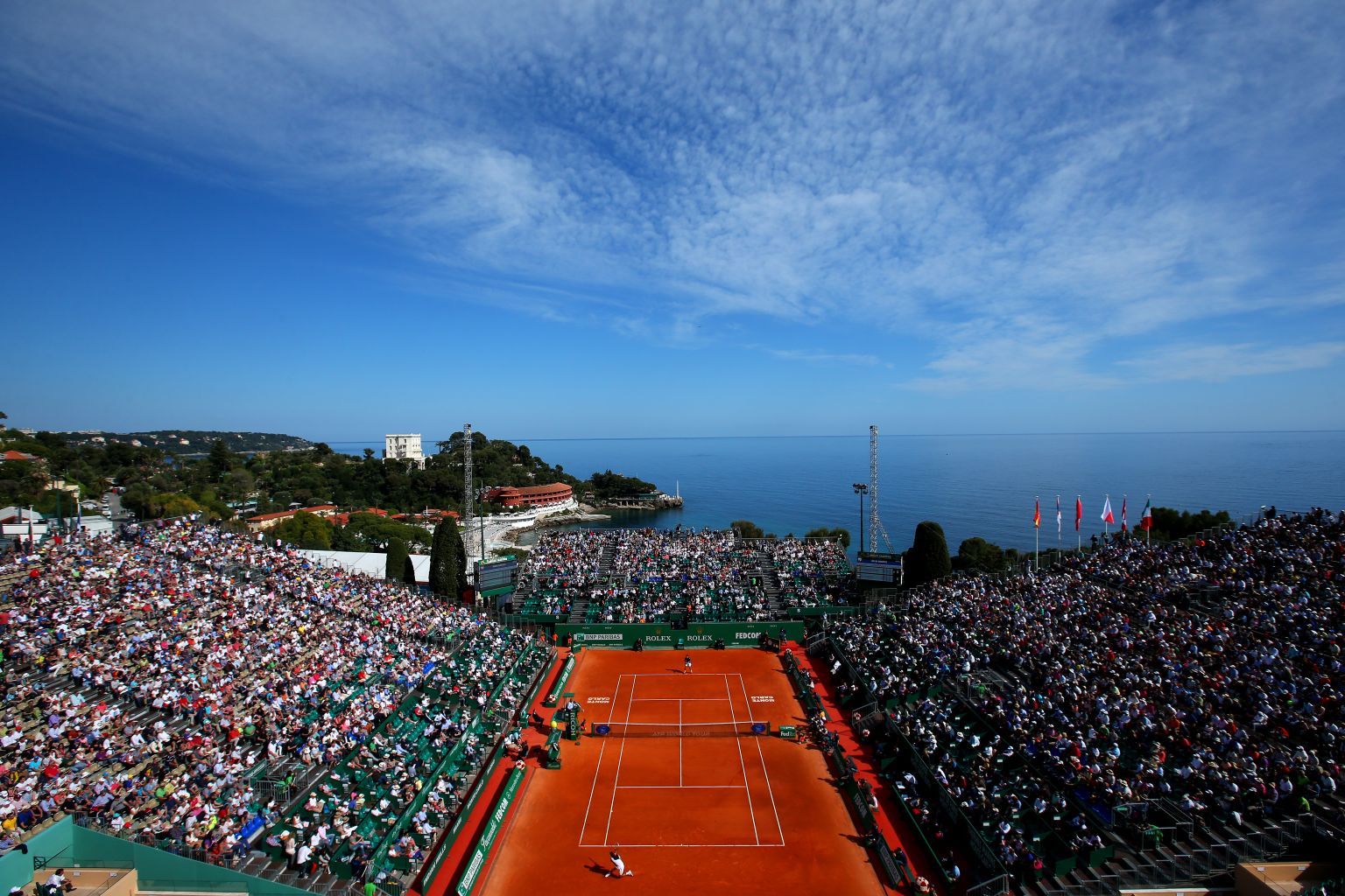 Als wir am nächsten Tag schon um elf Uhr auf der Anlage ankommen, um vor unserer Verabredung den Club noch weiter zu erkunden, trainiert auf dem Centre Court gerade das französische Davis Cup-Team. Tsonga, Monfils und Co. werden hier in ein paar Tagen im Viertelfinale gegen die USA antreten. Der Himmel ist wolkenlos, die Sonne scheint, es ist traumhaftes Frühlingswetter. Hinter dem Stadion glitzert das scheinbar endlos blaue Meer – so als hätten einige der millionenschweren Monegassen tonnenweise Swarowski-Steine hineingeschüttet. Eine schönere Atmosphäre zum Tennisspielen kann man sich nicht vorstellen.